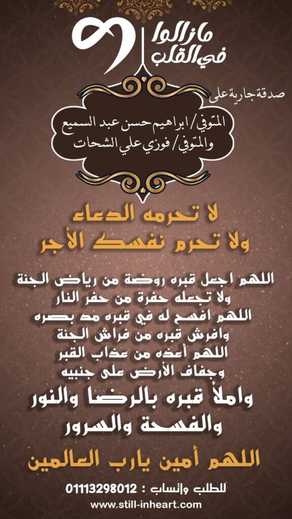 اللهم انقلهم من ضيق اللحود ومن مراتع الدود الى جناتك جنات الخلود لا اله الا انت يا حنان يا منان يا بديع السموات والأرض تغمد ( "المتوفي/ ابراهيم حسن عبد السميع