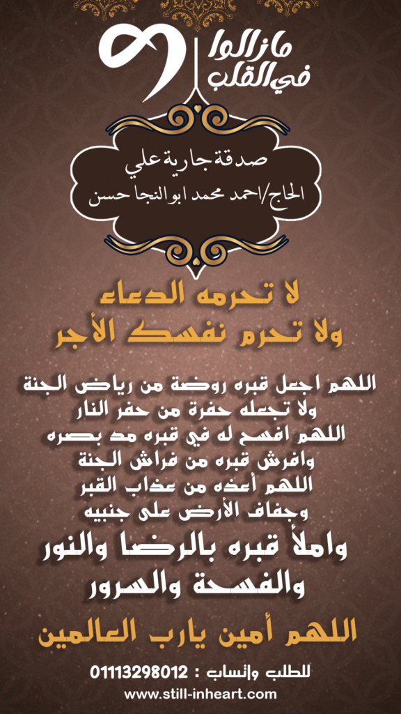 اللهم ان ( الحاج/احمد محمد ابو النجا حسن ) في ذمتك وحبل جوارك فقه من فتنة القبر وعذاب النار وانت اهل الوفاء والحق فاغفر له وارحمه انك انت الغفور الرحيم