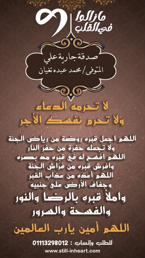 اللهم انقله من ضيق اللحود ومن مراتع الدود الى جناتك جنات الخلود لا اله الا انت يا حنان يا منان يا بديع السموات والأرض تغمد ( المتوفى محمد عبده تغيان ) برحمتك يا ارحم الراحمين