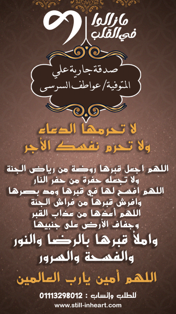 اللهم انقلها من ضيق اللحود ومن مراتع الدود الى جناتك جنات الخلود لا اله الا انت يا حنان يا منان يا بديع السموات والأرض تغمد ( "المتوفية/ عواطف السرسى