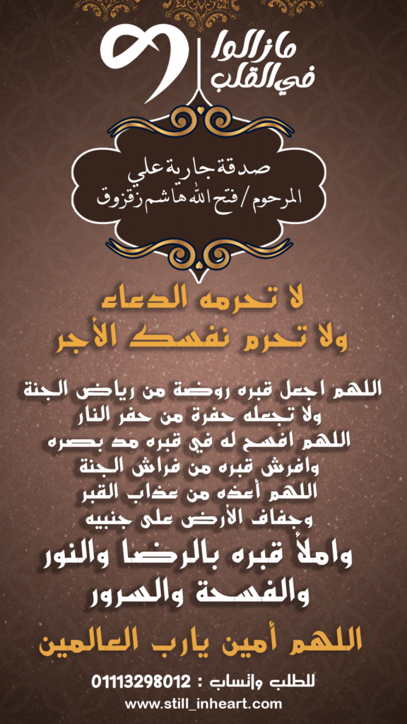 اللهم ان (المرحوم / فتح الله هاشم زقزوق) في ذمتك وحبل جوارك فقه من فتنة القبر وعذاب النار وانت اهل الوفاء والحق فاغفر له وارحمه انك انت الغفور الرحيم