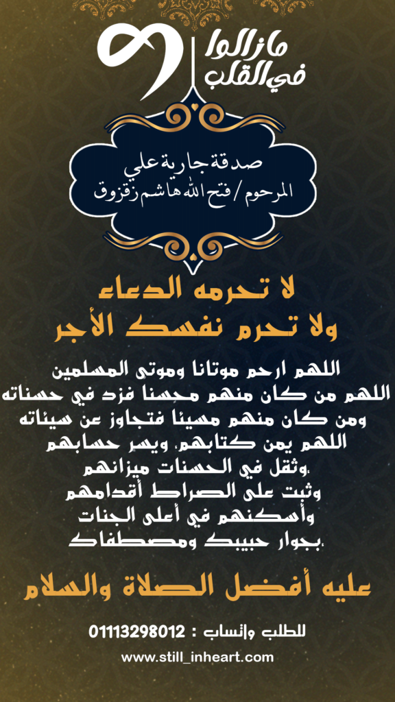 اللهم من احييته منا فأحييه على الإسلام . ومن توفيته منا فتوفاه على الإيمان . اللهم ارحم ( المرحوم / فتح الله هاشم زقزوق) رحمة واسعة وتغمده برحمتك