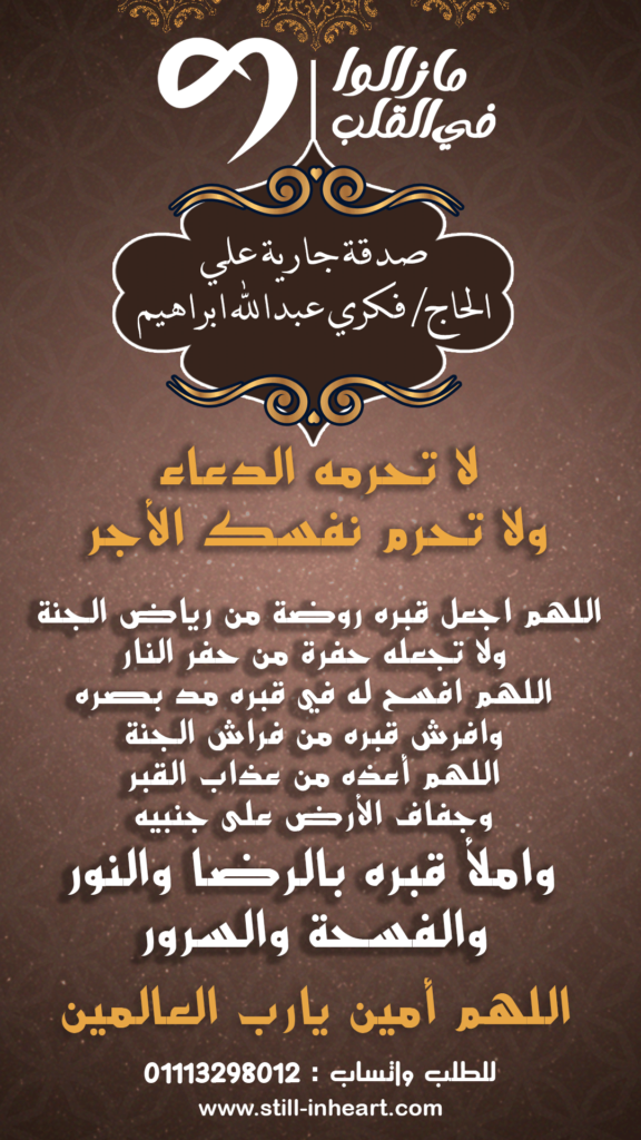 اللهم من احييته منا فأحييه على الإسلام . ومن توفيته منا فتوفاه على الإيمان . اللهم ارحم ( الحاج/ فكري عبدالله ابراهيم