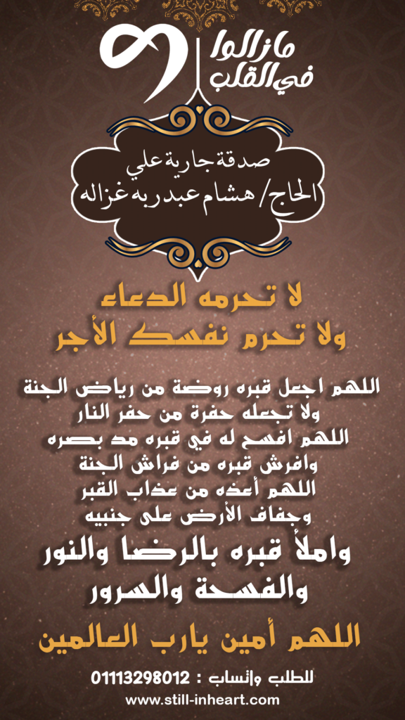 اللهم من احييته منا فأحييه على الإسلام . ومن توفيته منا فتوفاه على الإيمان . اللهم ارحم ( الحاج/ هشام عبدربه غزاله ) رحمة واسعة وتغمده برحمتك