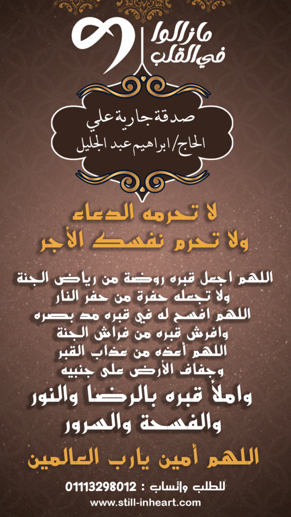 اللهم من احييته منا فأحييه على الإسلام . ومن توفيته منا فتوفاه على الإيمان . اللهم ارحم ( الحاج/ ابراهيم عبد الجليل ) رحمة واسعة وتغمده برحمتك