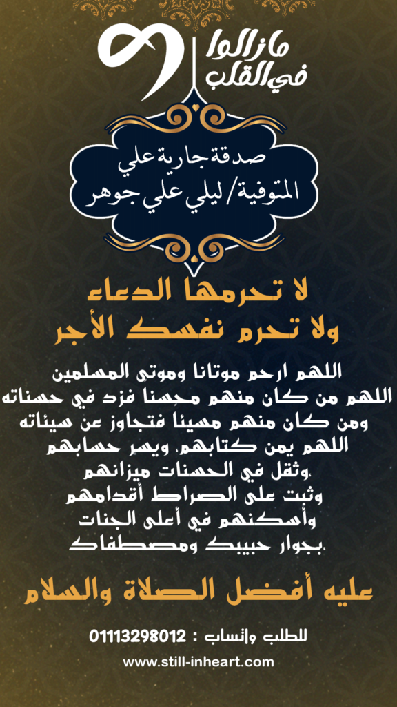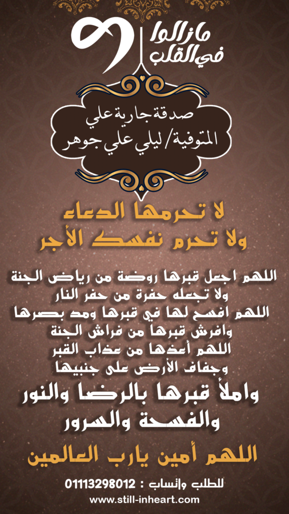 اللهم من احييته منا فأحييه على الإسلام . ومن توفيته منا فتوفاه على الإيمان . اللهم ارحم ( المتوفية/ ليلي علي جوهر الشريف ) رحمة واسعة وتغمدها برحمتك