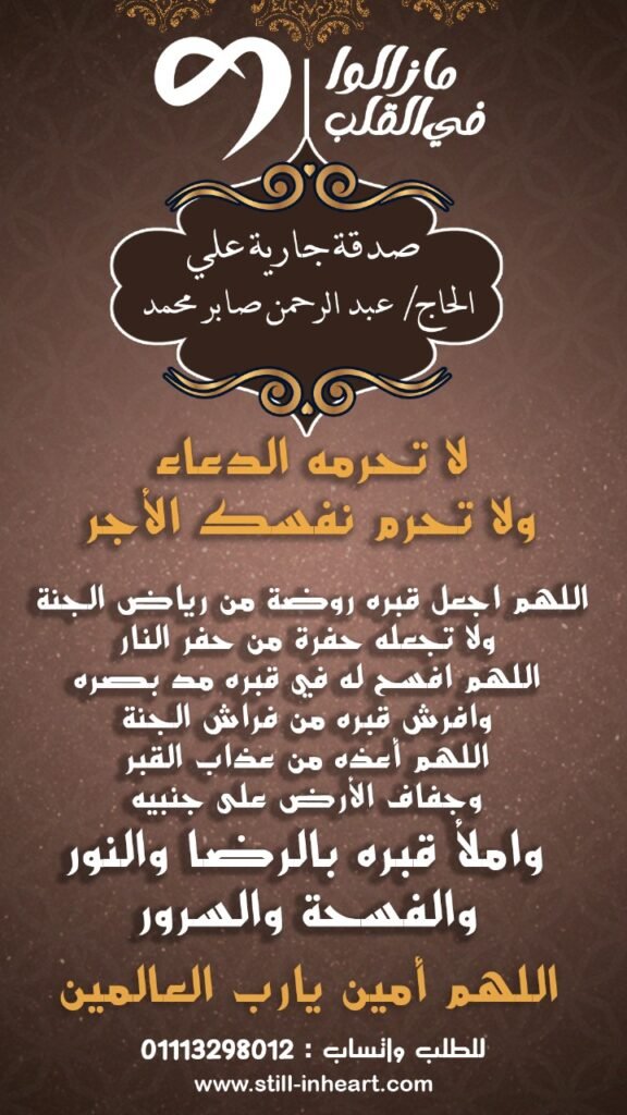 اللهم ان (الحاج/ عبد الرحمن صابر محمد) في ذمتك وحبل جوارك فقه من فتنة القبر وعذاب النار وانت اهل الوفاء والحق فاغفر له وارحمه انك انت الغفور الرحيم