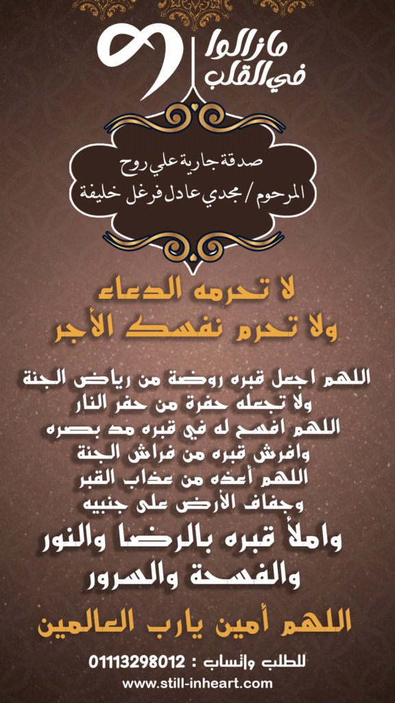 اللهم انقله من ضيق اللحود ومن مراتع الدود الى جناتك جنات الخلود لا اله الا انت يا حنان يا منان يا بديع السموات والأرض تغمد ( مجدي عادل فرغل عبد الحفيظ خليفة ) برحمتك يا ارحم الراحمين