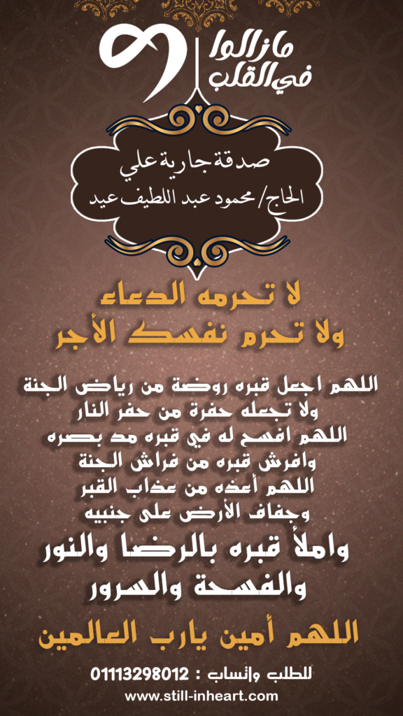اللهم من احييته منا فأحييه على الإسلام . ومن توفيته منا فتوفاه على الإيمان . اللهم ارحم ( الحاج/ محمود عبد اللطيف عيد ) رحمة واسعة وتغمده برحمتك