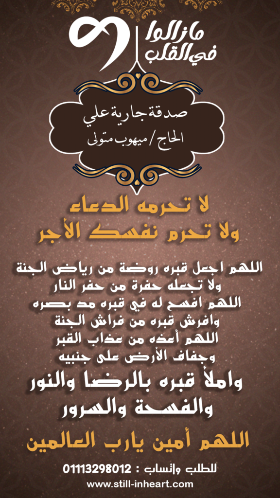 اللهم ان ( الحاج ميهوب متولى ) في ذمتك وحبل جوارك فقه من فتنة القبر وعذاب النار وانت اهل الوفاء والحق فاغفر له وارحمه انك انت الغفور الرحيم