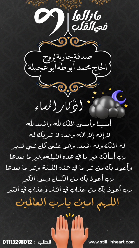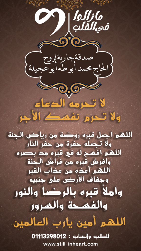 اللهم انقله من ضيق اللحود ومن مراتع الدود الى جناتك جنات الخلود لا اله الا انت يا حنان يا منان يا بديع السموات والأرض تغمد ( الحاج محمد أبو طه أبو عجيلة) برحمتك يا ارحم الراحمين
