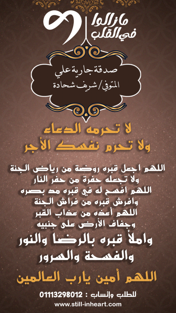 اللهم انقله من ضيق اللحود ومن مراتع الدود الى جناتك جنات الخلود لا اله الا انت يا حنان يا منان يا بديع السموات والأرض تغمد ( المتوفي/ شريف شحادة ) برحمتك يا ارحم الراحمين